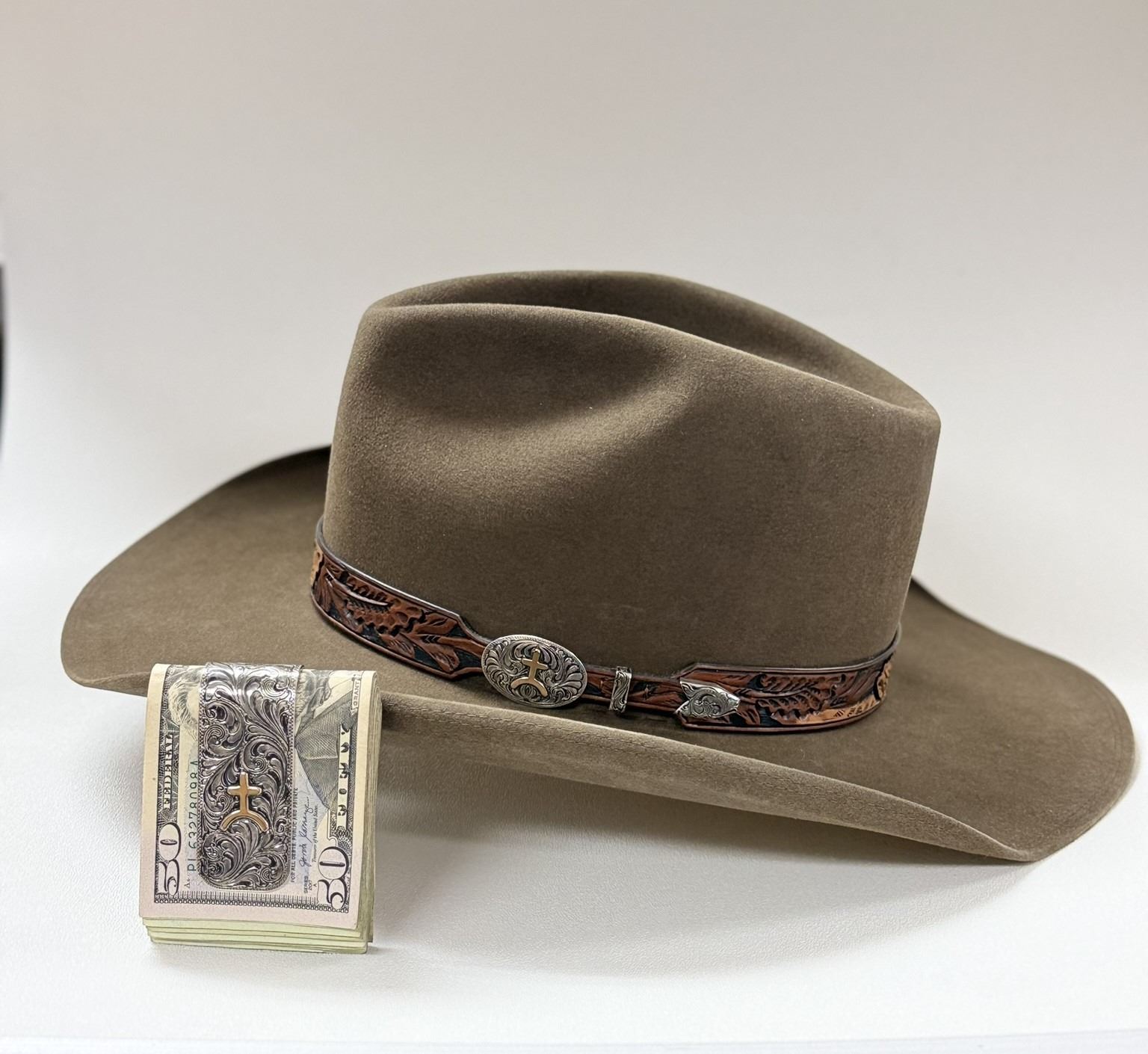 From the renowned artisans of Rand’s Custom Hatters and Silver King Silversmiths, The Heritage Brand Collection honors craftsmanship, heritage, and the enduring sophistication of the outdoorsman. This exclusive collaboration features a 100X Pure Beaver Fur Felt Hat in rich pecan, naturally finished without powders or artificial dyes for authentic color and weather resistance. Sized and shaped using Rand’s historic 1800s Conformateur, the hat offers a personalized fit complemented by a soft, perforated sheepskin sweatband for day-long comfort. The handcrafted three-tone leather hatband, tooled and adorned with sterling silver and 14K yellow gold, is custom-built to feature the buyer’s brand or initials on the silver buckle set—making each piece distinctly personal. Completing the ensemble, a wide sterling silver money clip bears a 14K gold brand or monogram of choice, a statement of individuality and Western refinement. Handcrafted in the USA, this collection exemplifies Rand’s and Silver King’s shared legacy of authenticity, artistry, and timeless style. For more information, please contact Rand's Custom Hatters by phone at 800-346-9815. Company's website: www.randhats.com & www.silverkingusa.com